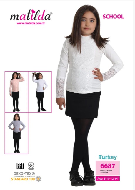 Трикотажная блузка для школы выполнена из хлопка с добавлением эластана. Рукава и перед блузки дополнен красивым гипюром.