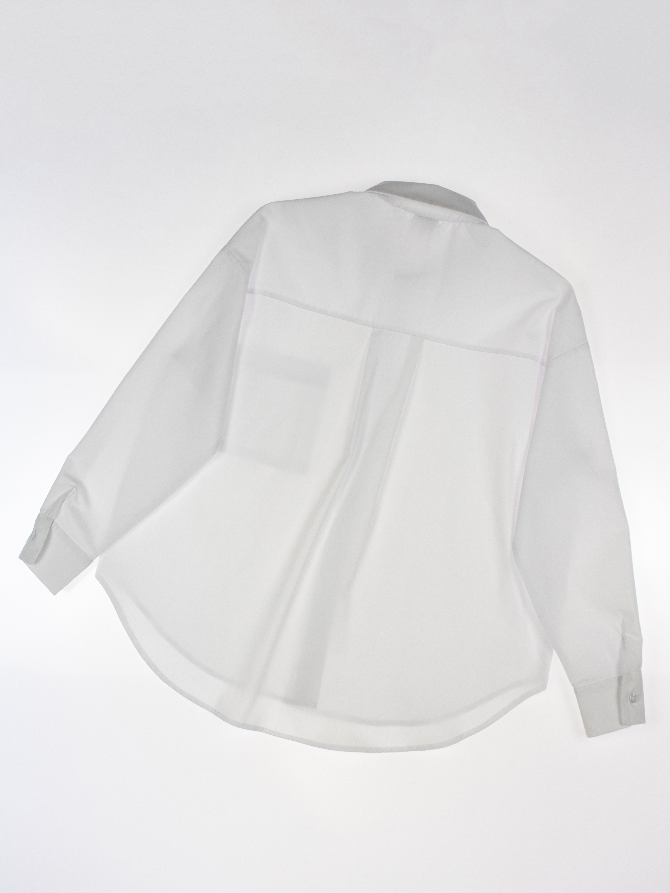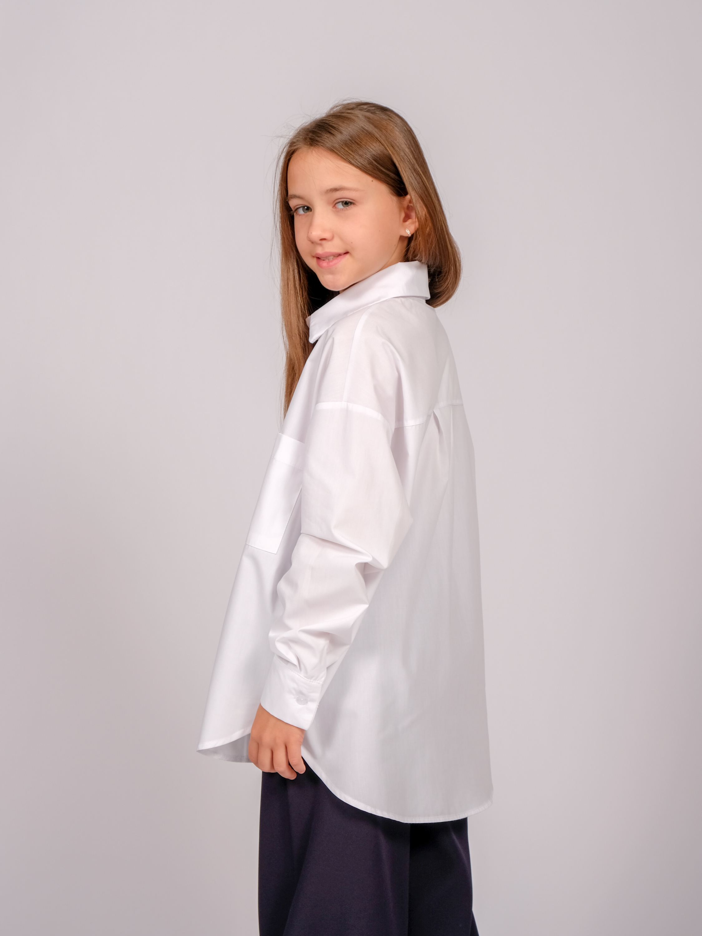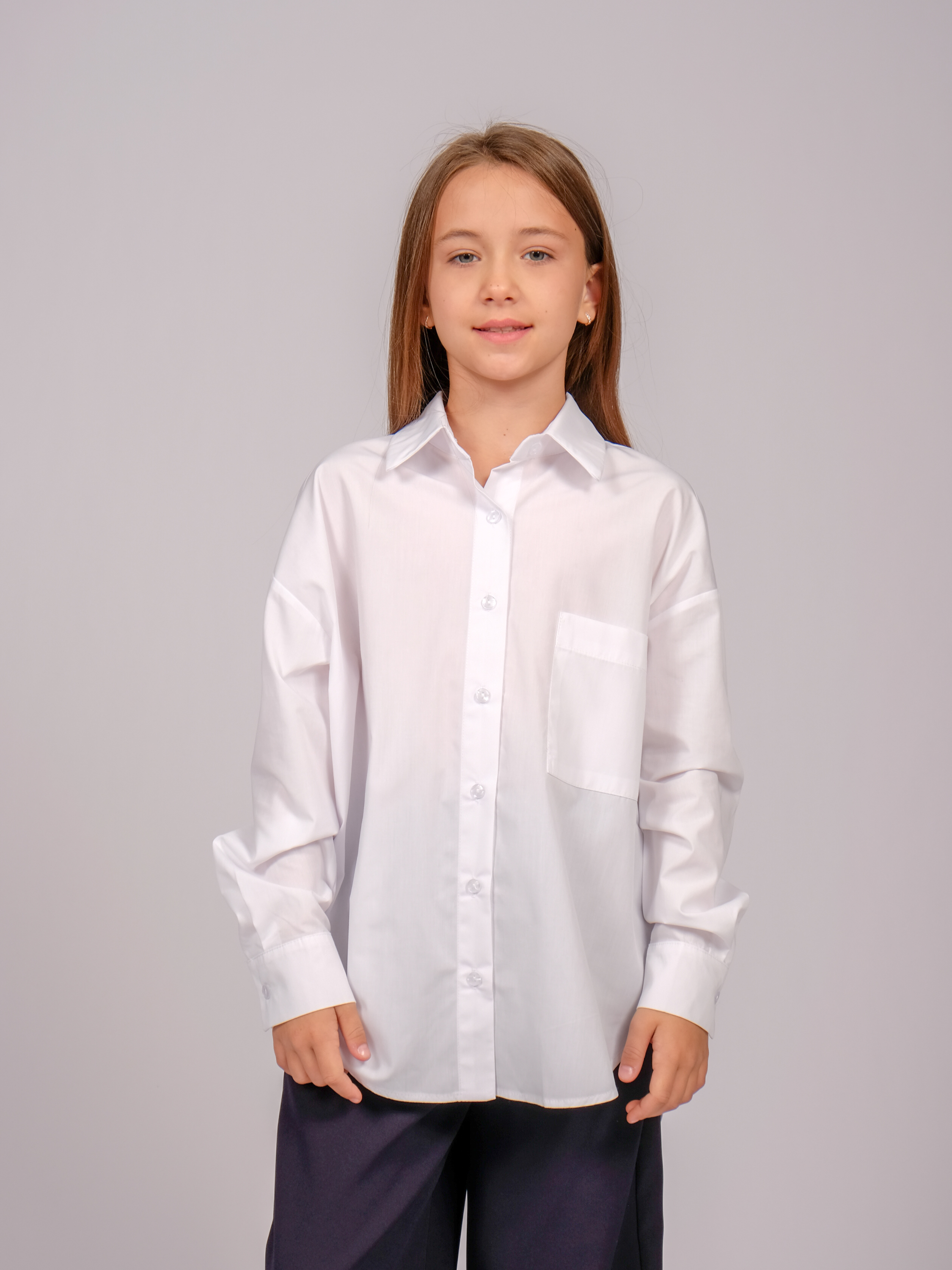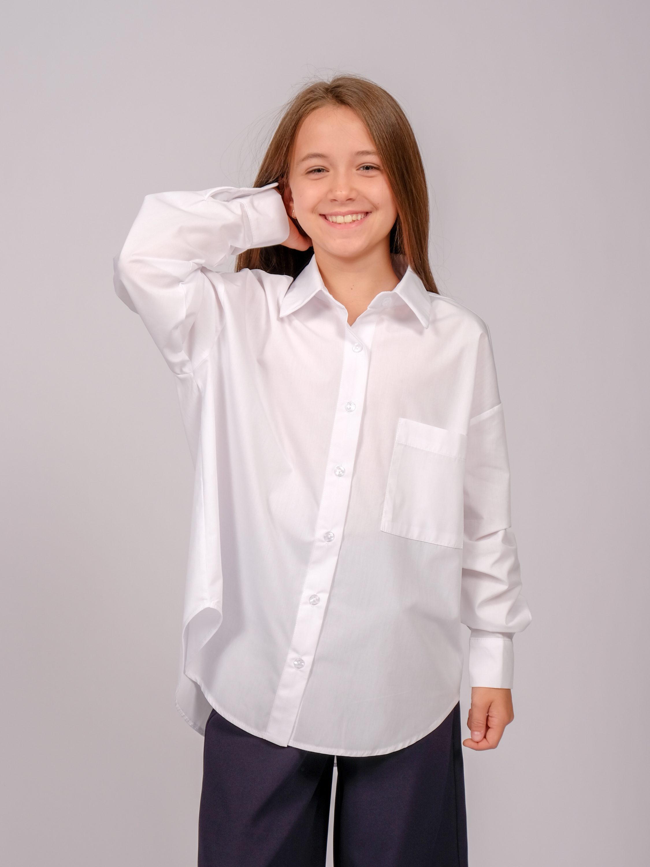 Школьная рубашка для девочки оптом. Модель объемная, прямого кроя, застегивается на пуговицы, рукава с манжетами.