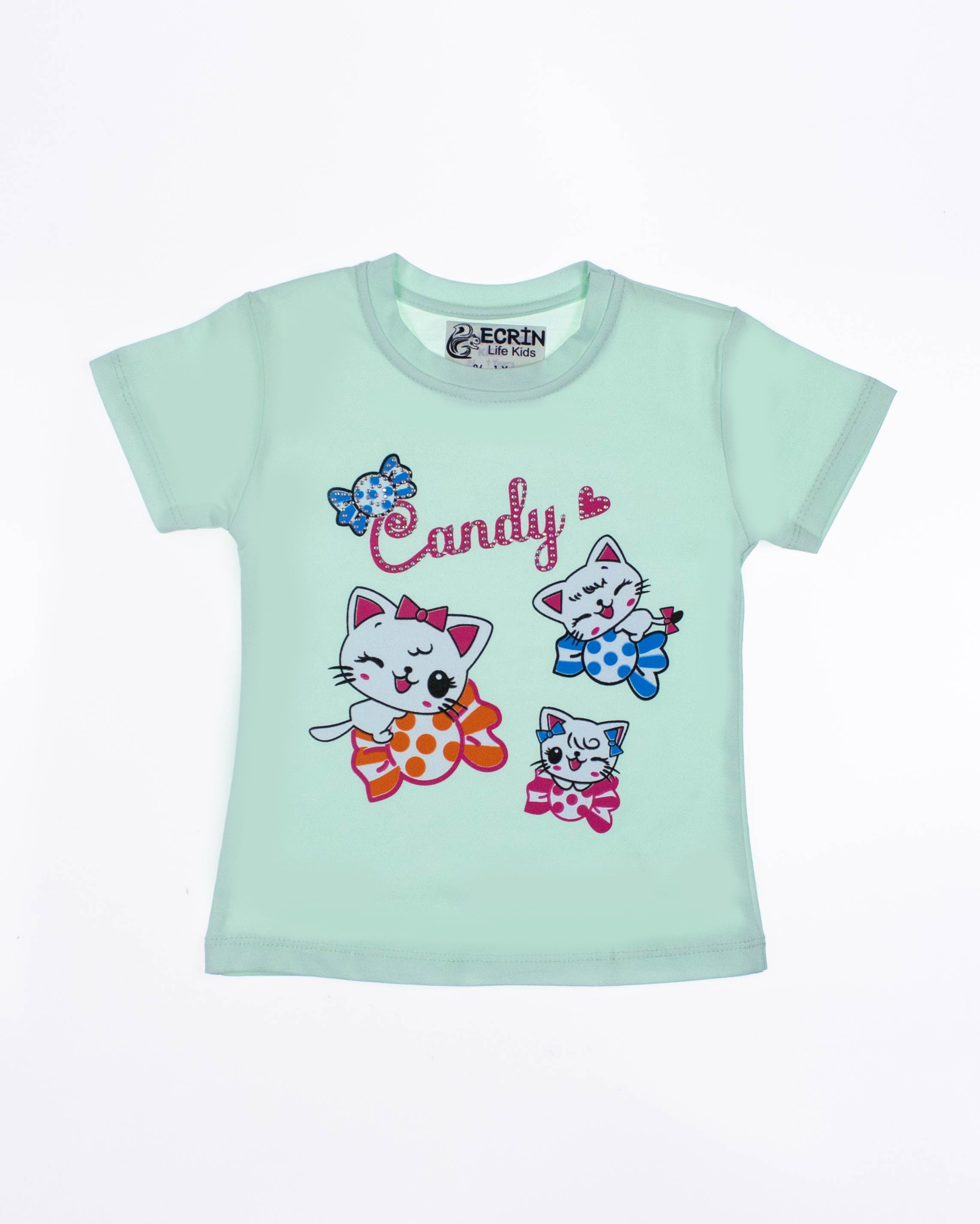 Футболка ECRIN для девочки оптом, производства Турция. Модель приталенного силуэта с короткими рукавами, милый принт украшен стразами.