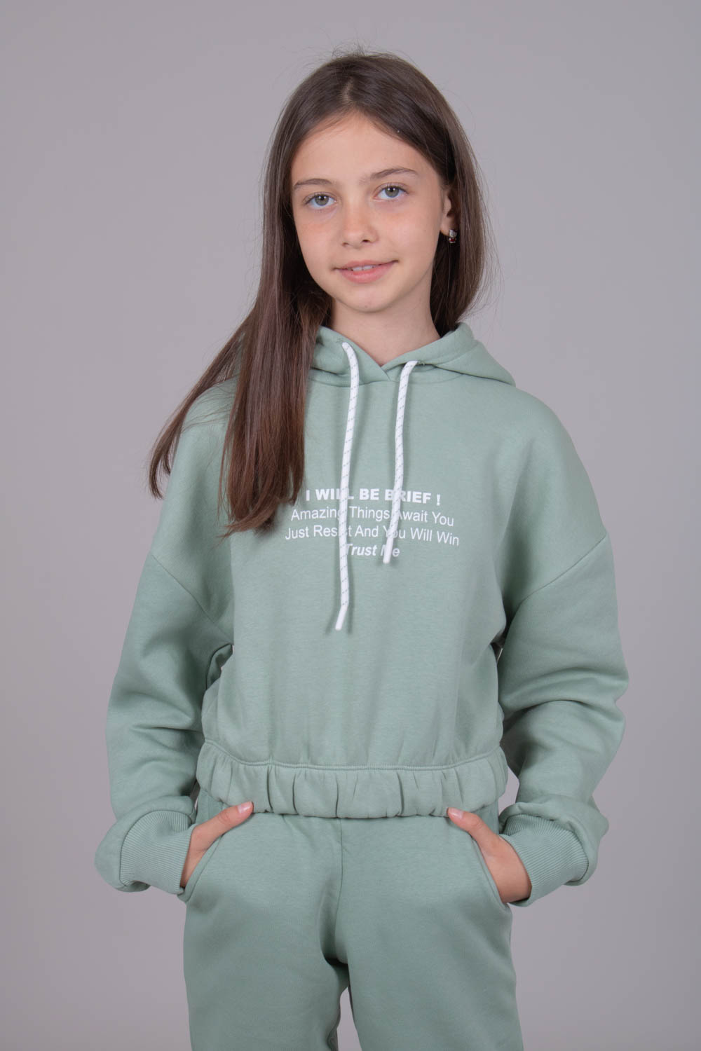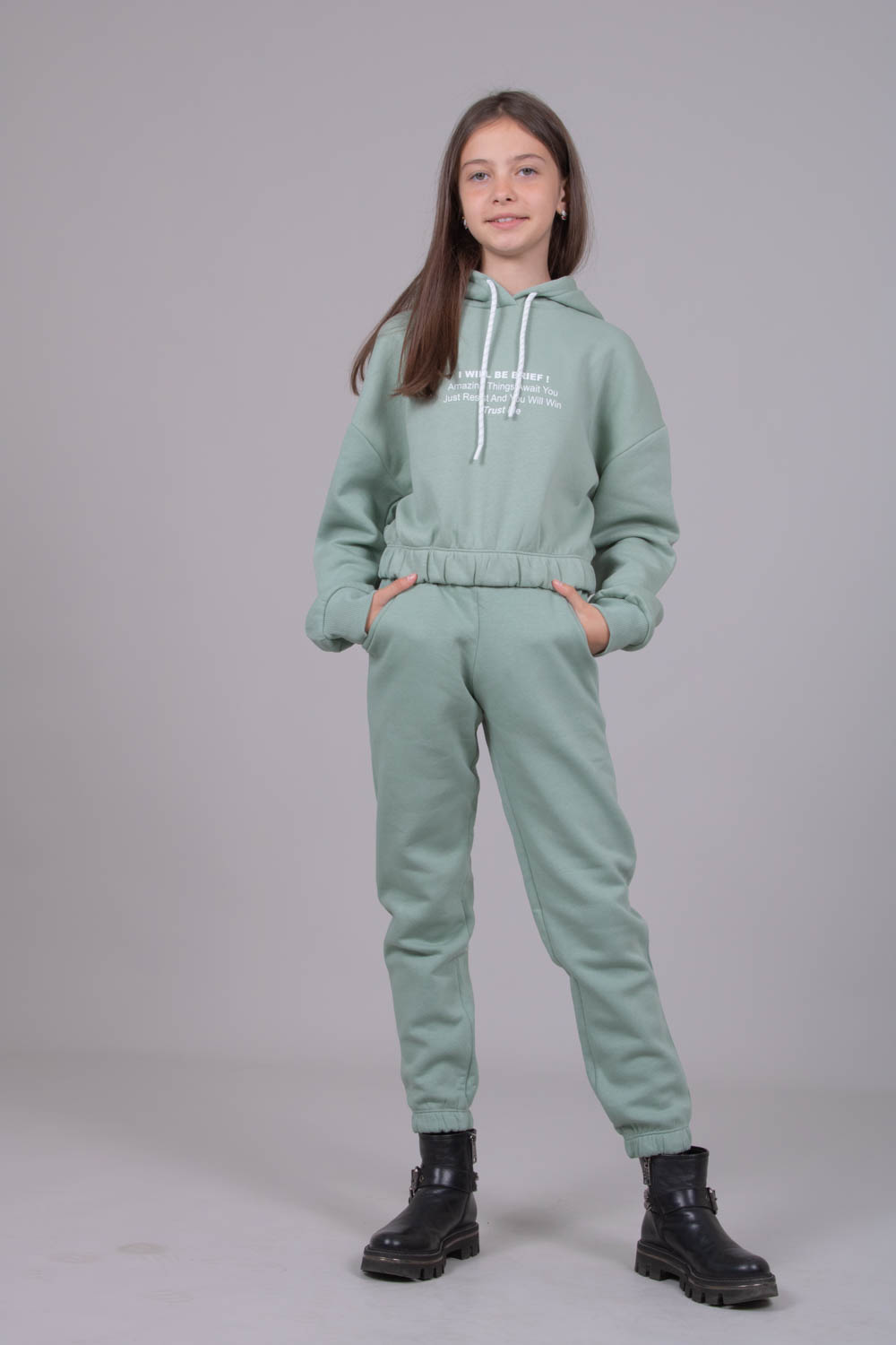 Утеплённый спортивный костюм для девочек в из плотного футера с начесом. Оптимальный объём худи не будет сковывать движений, легко сочетается с верхней одеждой. Худи укороченное на резинке, с объемным капюшоном. Утеплённые брюки на манжетах с боковыми карманами.