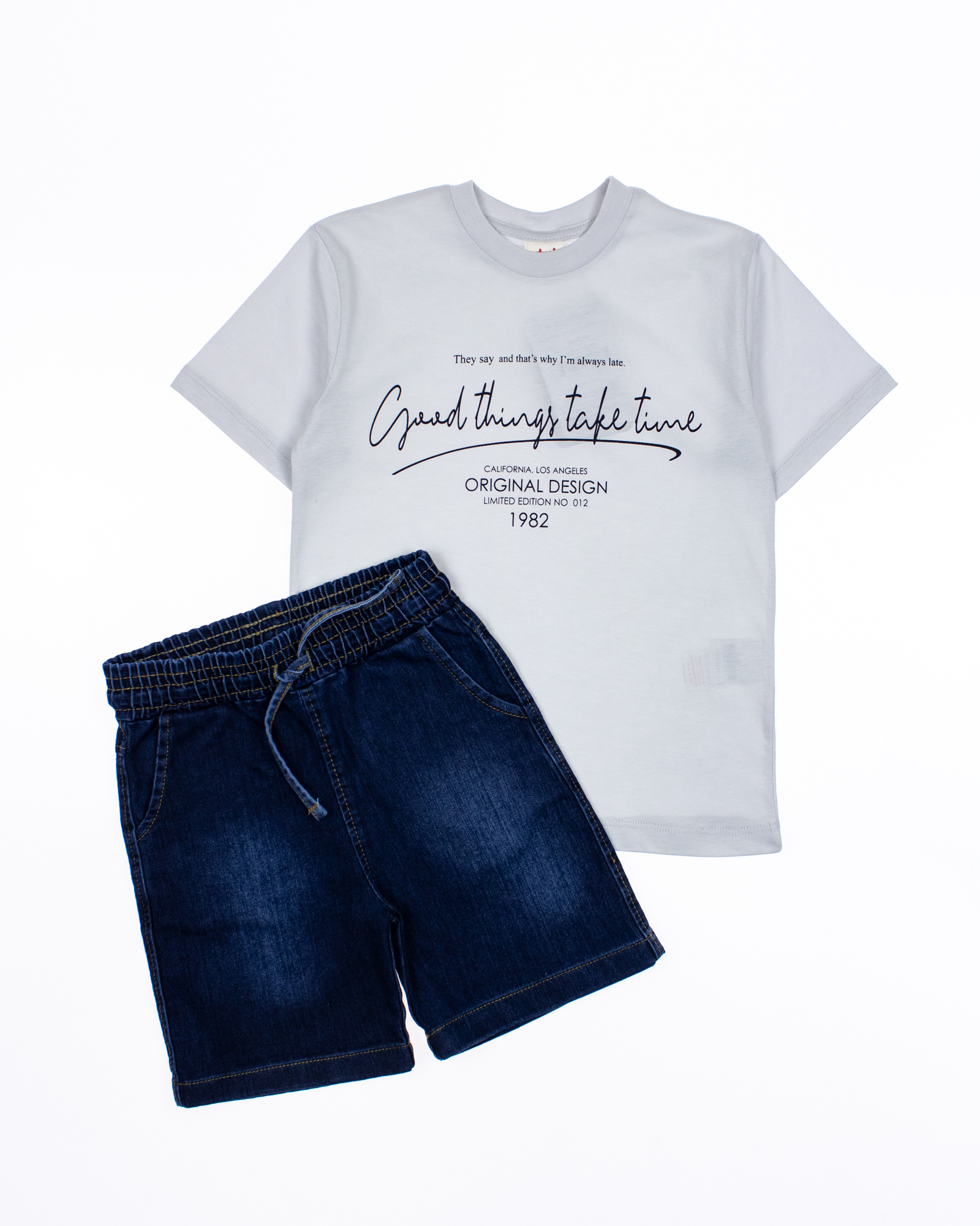 Летний костюм dmb  для мальчика оптом. Футболка прямого кроя с короткими рукавами. Бриджи  джинсовые  с  карманами. Пояс на резинке с функциональным шнурком позволяет ругулировать объем на талии. Большой выбор костюмов для мальчиков по низким ценам в интернет-магазине Tamriko оптом.