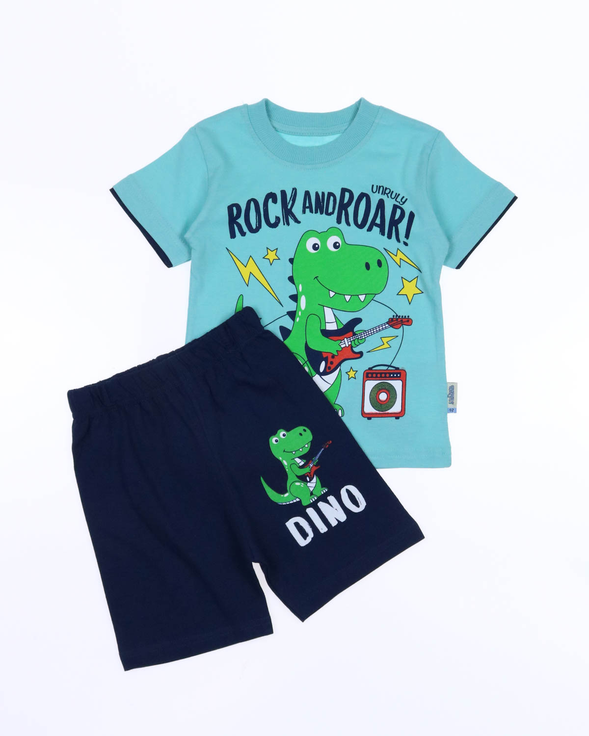 Костюм для мальчика, состоит из футболки и шорт. Модель выполнена из хлопкового полотна и оформлена печатным принтом. Футболка прямого кроя, с округлым вырезом горловины. Ткань кулирная гладь.