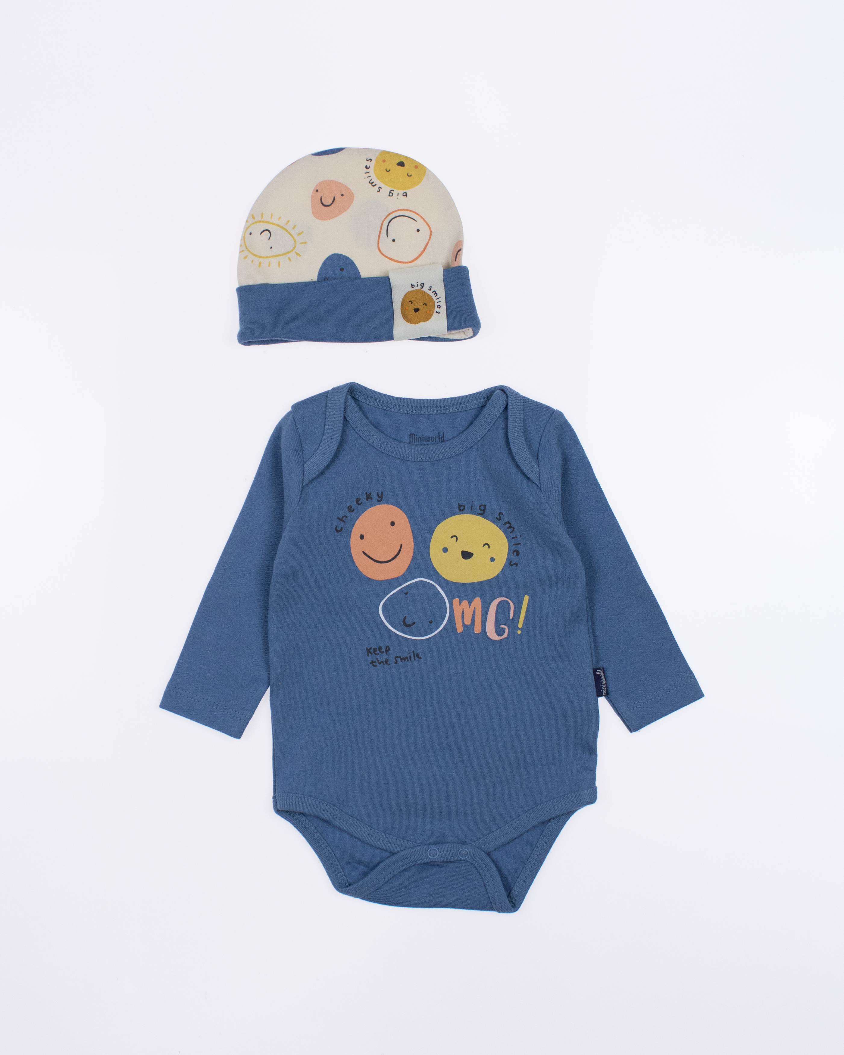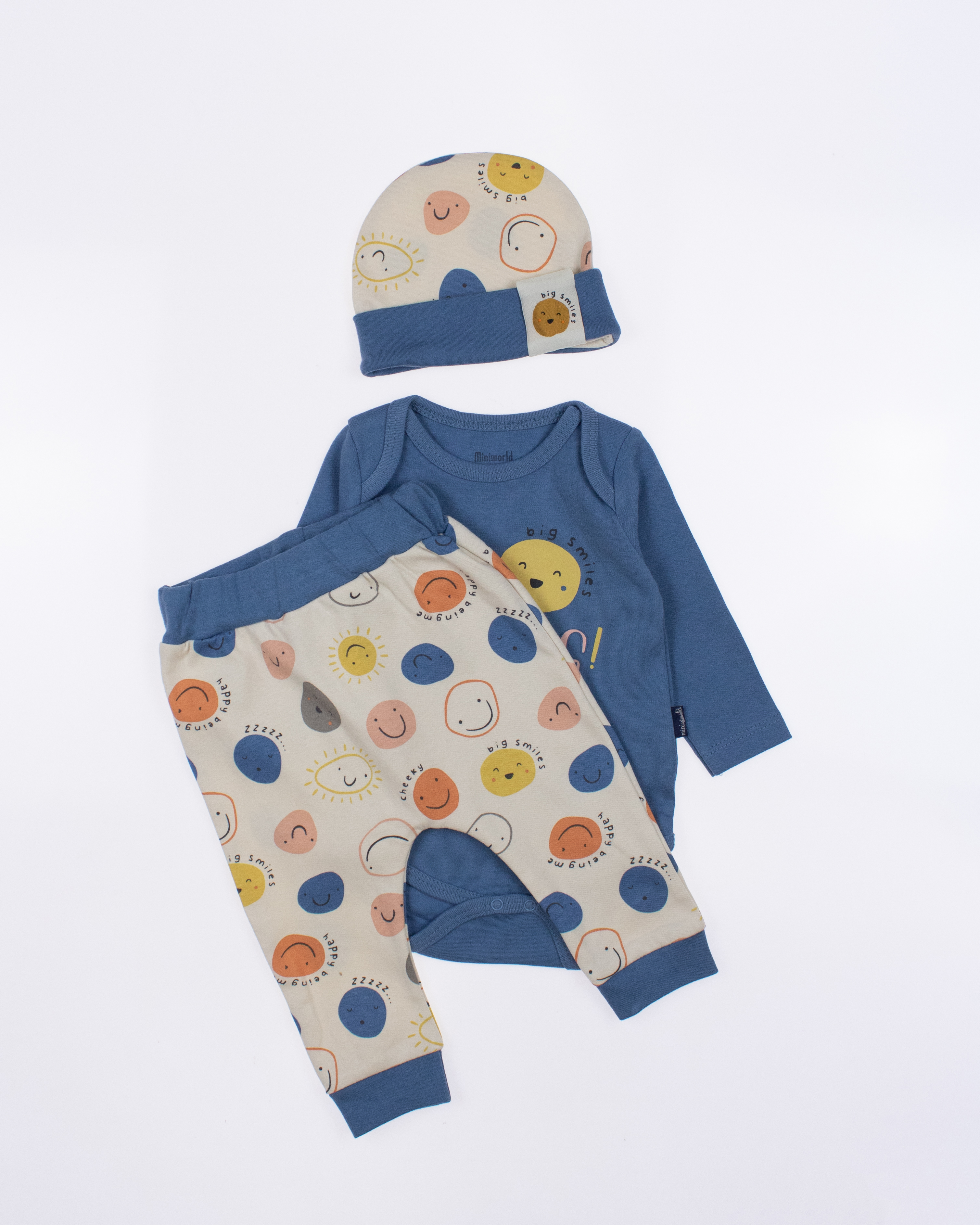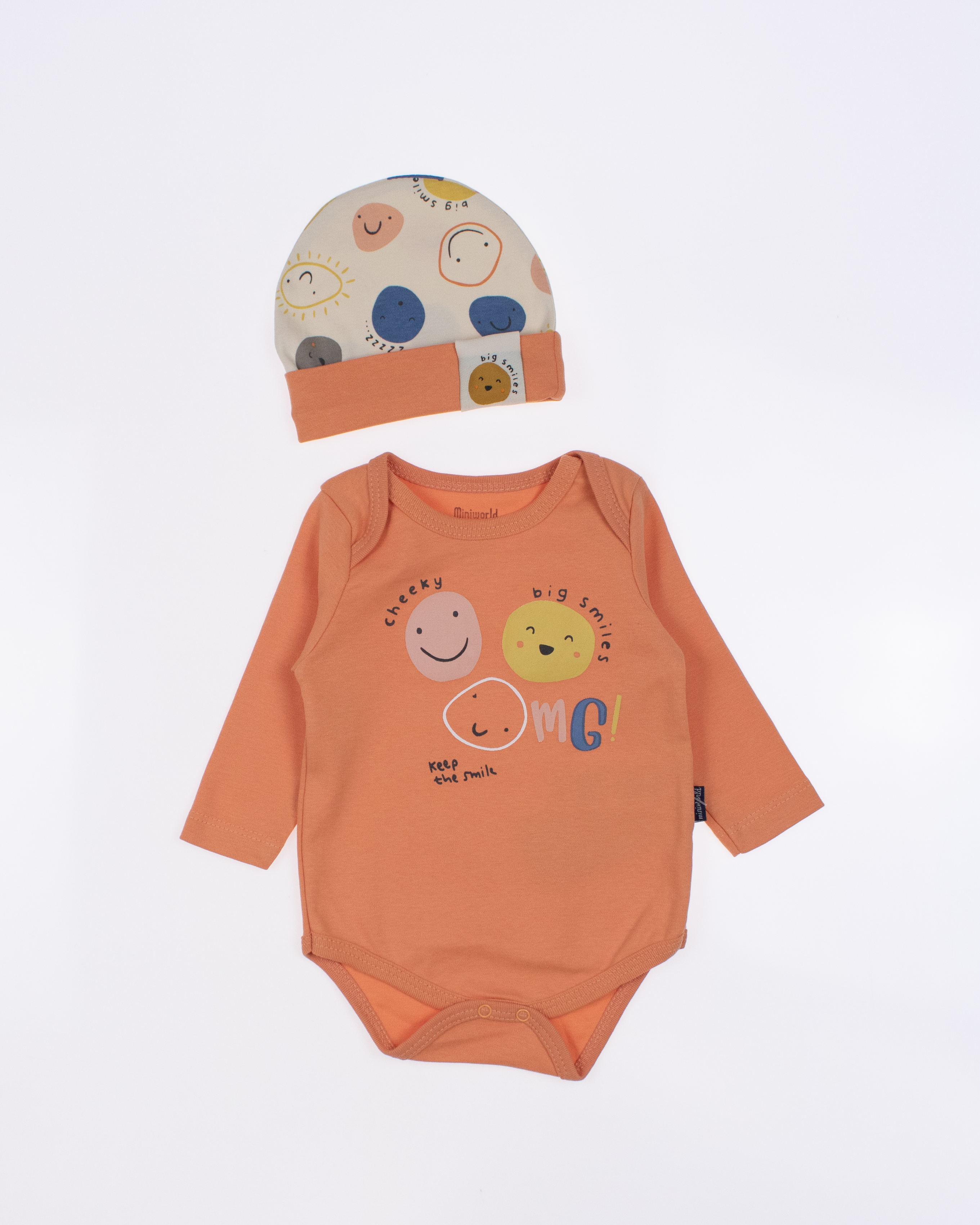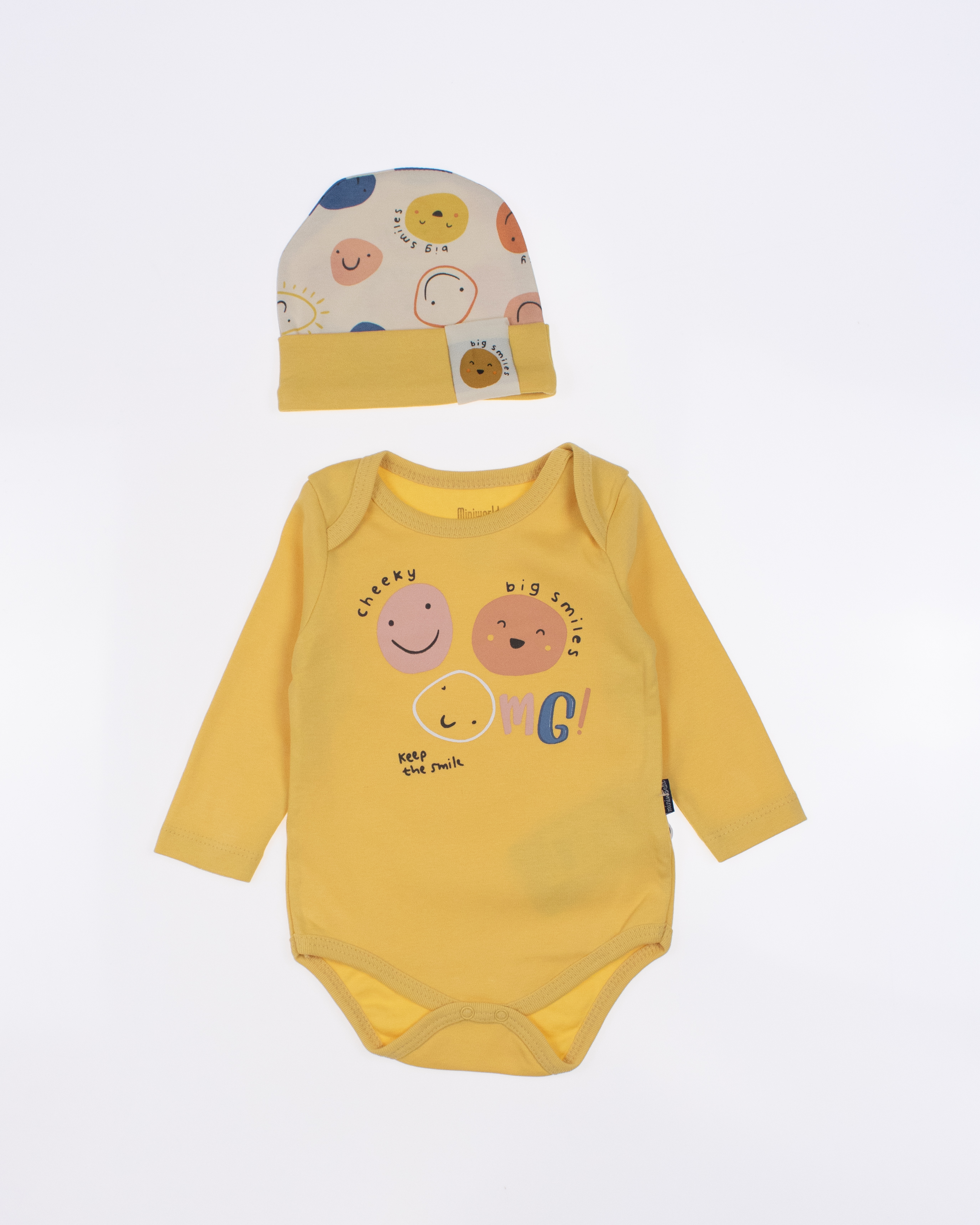 Детский боди MINIWORLD с длинным рукавом, штанишки и шапочка - комплект, который подойдет малышам с самых первых дней жизни. Боди для новорожденного  очень удобен, снизу оснащён кнопками, благодаря которым маме будет удобно в любое время менять памперс  ребенку.