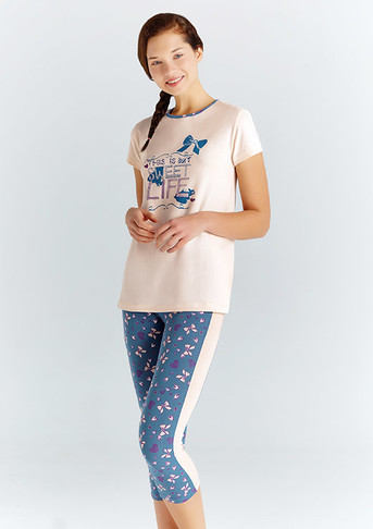 Cтильная пижама для девочки сделана из натурального дышащего материала. Популярная модель от турецкого бренда Baykar дополнена принтом и набивным рисунком. Классическая футболка с коротким рукавом и высокой горловиной имеет форму трапеции. Бриджи с контрастными лампасами плотно прилегают к телу, не мешают движениям.